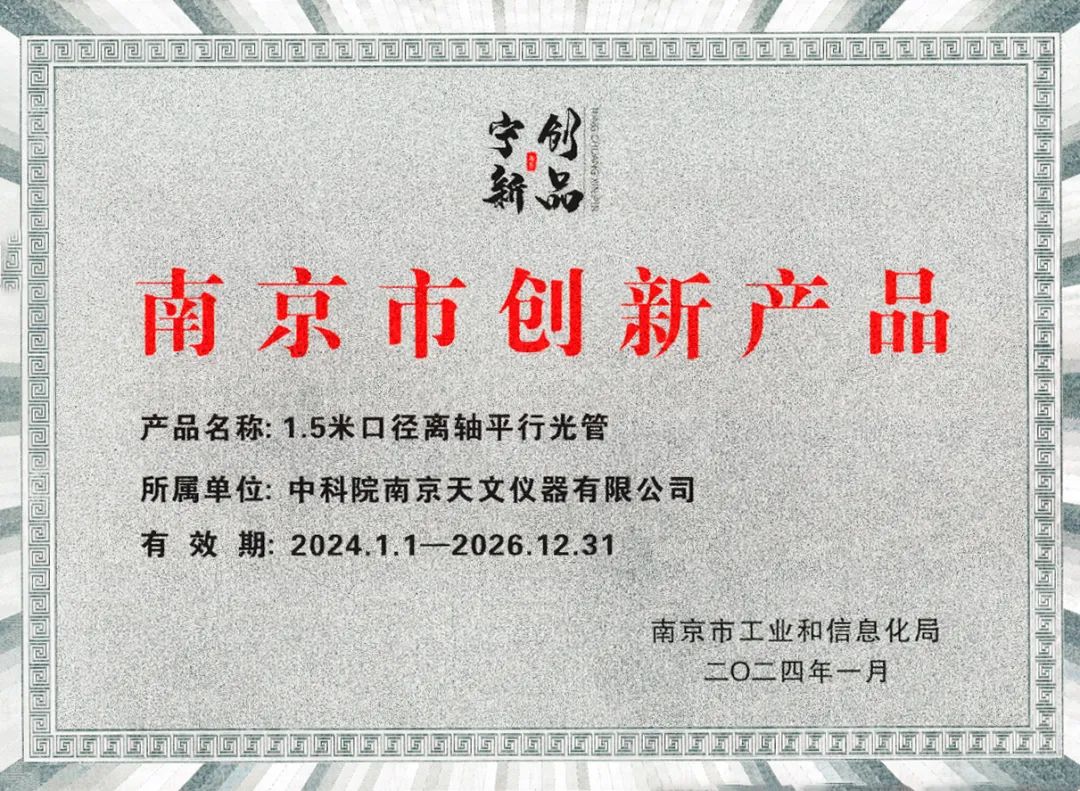 日前,由中科院南京天文儀器有限公司研發生產的“1.5米口徑離軸平行光管”榮獲“南京市創新產品”榮譽,并參加巡展。此次認定由南京市工信局組織實施,旨在加快創新產品推廣和產業化,打造“南京創造”系列產品和品牌。